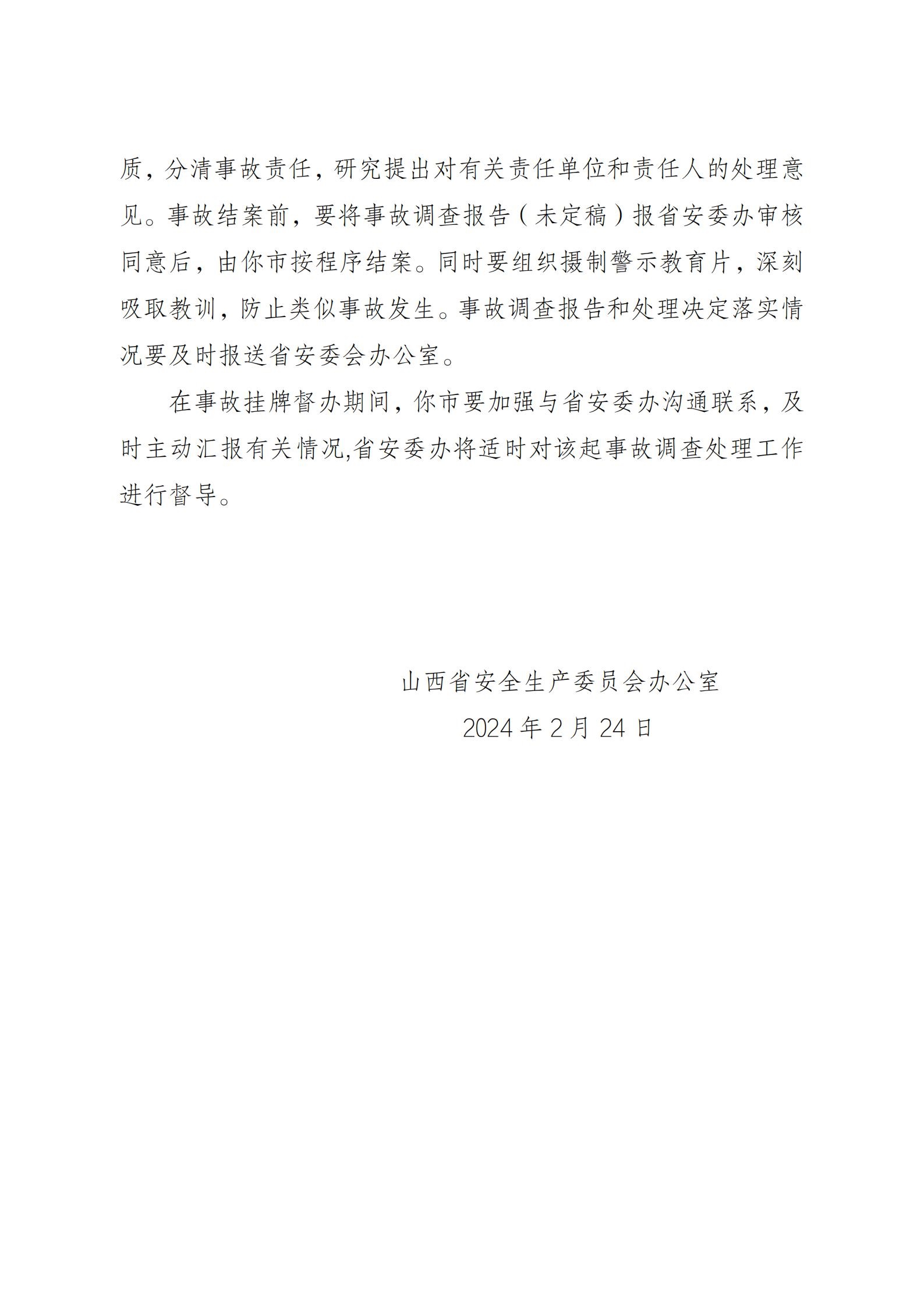 根據(jù)《國務(wù)院關(guān)于進一步加強企業(yè)安全生產(chǎn)工作的通知》《山西省較大事故查處掛牌督辦辦法》等有關(guān)規(guī)定要求,山西省安委辦決定對該起事故查處實行掛牌督辦。要求呂梁市依據(jù)有關(guān)法律法規(guī)和規(guī)定,組織進行事故調(diào)查,查明事故原因,認定事故性質(zhì),分清事故責任,研究提出對有關(guān)責任單位和責任人的處理意見。事故結(jié)案前,要將事故調(diào)查報告報山西省安委辦審核同意后,由呂梁市按程序結(jié)案。同時要組織攝制警示教育片,深刻吸取教訓,防止類似事故發(fā)生。事故調(diào)查報告和處理決定落實情況要及時報送山西省安委辦。