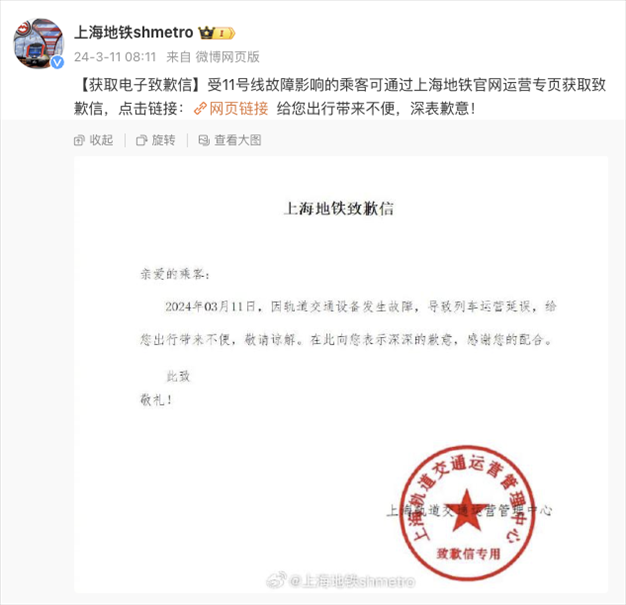 央視網(wǎng)消息:@上海地鐵shmetro 今早消息,上海地鐵今早消息,11號線因車輛故障,嘉定新城往武威路方向列車限速運行,發(fā)車班次間隔延長,預(yù)計晚點15分鐘以上,請乘客們及時調(diào)整出行路徑,以免耽誤行程。隨后,上海地鐵官方向全體乘客發(fā)布致歉信表示歉意。目前,11號線運營已恢復(fù)正常。