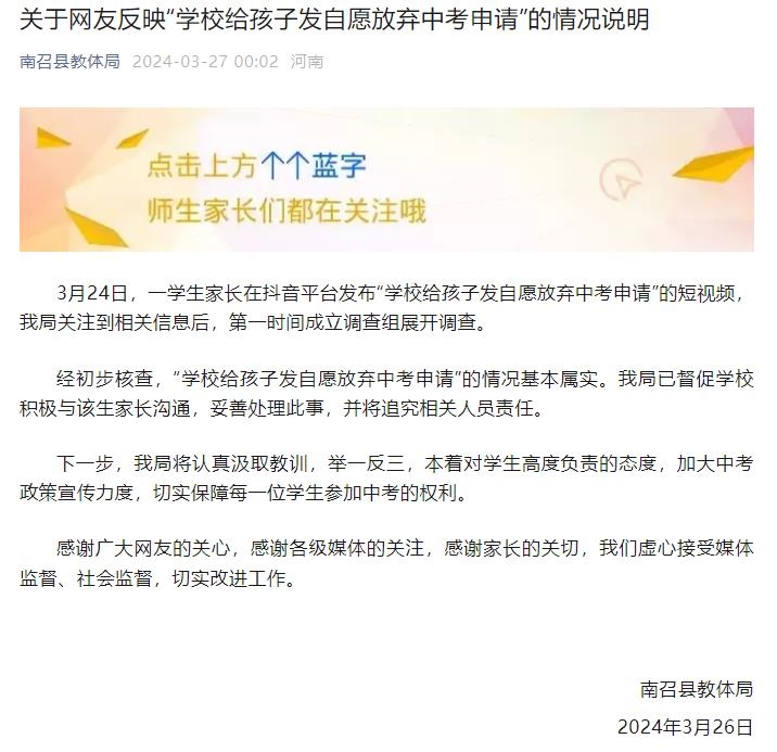 說明稱,3月24日,一學(xué)生家長(zhǎng)在抖音平臺(tái)發(fā)布“學(xué)校給孩子發(fā)自愿放棄中考申請(qǐng)”的短視頻,該局關(guān)注到相關(guān)信息后,第一時(shí)間成立調(diào)查組展開調(diào)查。