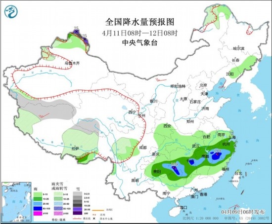 4月11日08時至12日08時,新疆北疆北部、內(nèi)蒙古東北部、黑龍江西北部、西藏西部和中北部、青海南部、川西高原等地部分地區(qū)有小到中雪或雨夾雪,其中,新疆北疆北部高海拔地區(qū)有大到暴雪,局地大暴雪(20~25毫米)。貴州東部、廣西北部、江南大部的部分地區(qū)有中到大雨,其中,湖南東部和西南部、廣西北部、江西東北部、浙江西南部、福建西北部等地部分地區(qū)有暴雨或大暴雨(100~120毫米)。內(nèi)蒙古西北部、西藏西部等地部分地區(qū)有4~5級風(fēng)。