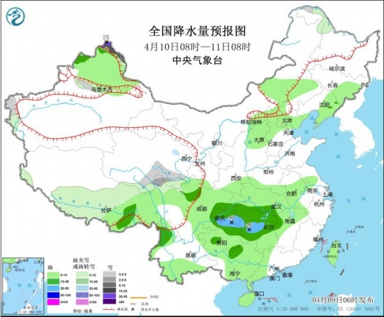 4月10日08時至11日08時,新疆北疆北部、黑龍江西北部、西藏中部和北部、青海東南部、川西高原北部等地部分地區(qū)有小到中雪或雨夾雪,其中,新疆北疆北部高海拔地區(qū)有大到暴雪,局地大暴雪(20~25毫米)。內(nèi)蒙古東部、華北北部、東北地區(qū)東部、新疆北部、西藏東部、四川盆地大部、重慶、江淮西部、江漢、江南北部和西部、貴州大部、廣西大部、云南西部和南部、海南島、臺灣島等地部分地區(qū)有小到中雨,其中,重慶東南部、貴州北部、湖南中西部等地部分地區(qū)有大雨(25~40毫米)。新疆東部部分地區(qū)有6~7級風(fēng)。
