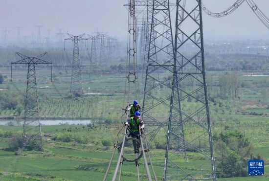 4月9日,在位于安徽省合肥市廬江縣郭河鎮(zhèn)的直流±800千伏建蘇線3418號桿塔處,國網(wǎng)合肥供電公司工人進(jìn)行高空檢修作業(yè)(無人機照片)。