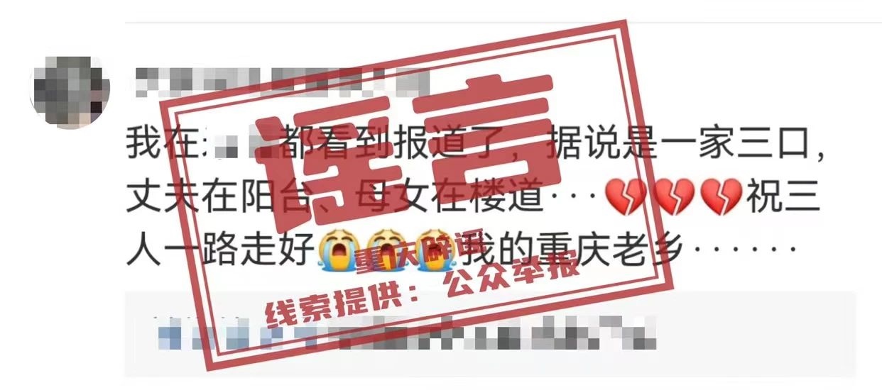 4月15日,“重慶辟謠”發(fā)消息稱,經(jīng)相關(guān)部門核查,沙坪壩、合川均未發(fā)生“一家人全部上吊而死”案件,網(wǎng)傳信息為謠言,相關(guān)視頻系某網(wǎng)民拼湊網(wǎng)上的兩起自殺事件,并杜撰虛假信息。目前,該虛假信息已轉(zhuǎn)交相關(guān)部門,以對發(fā)布虛假信息者依法進行調(diào)查處置。