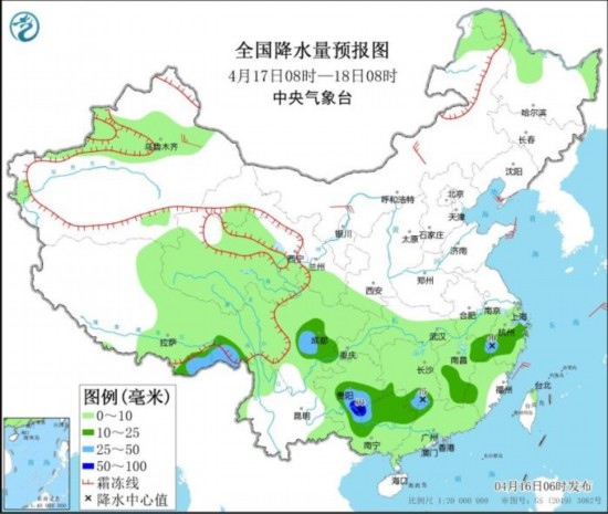 全國降水量預(yù)報(bào)圖(4月16日08時(shí)-17日08時(shí))