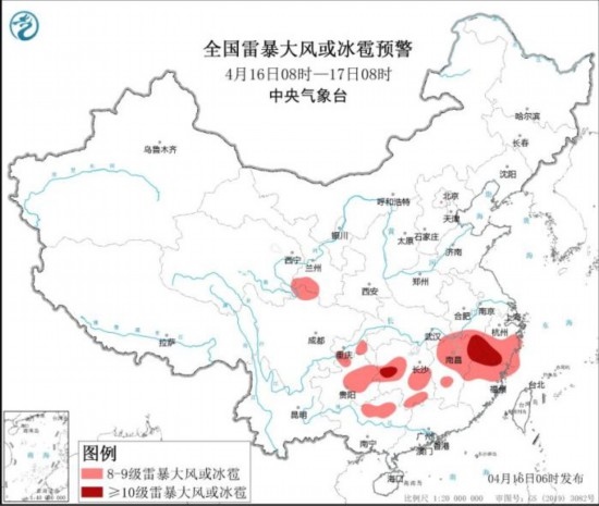 全國雷暴大風(fēng)或冰雹預(yù)警圖(4月16日08時(shí)-17日08時(shí))