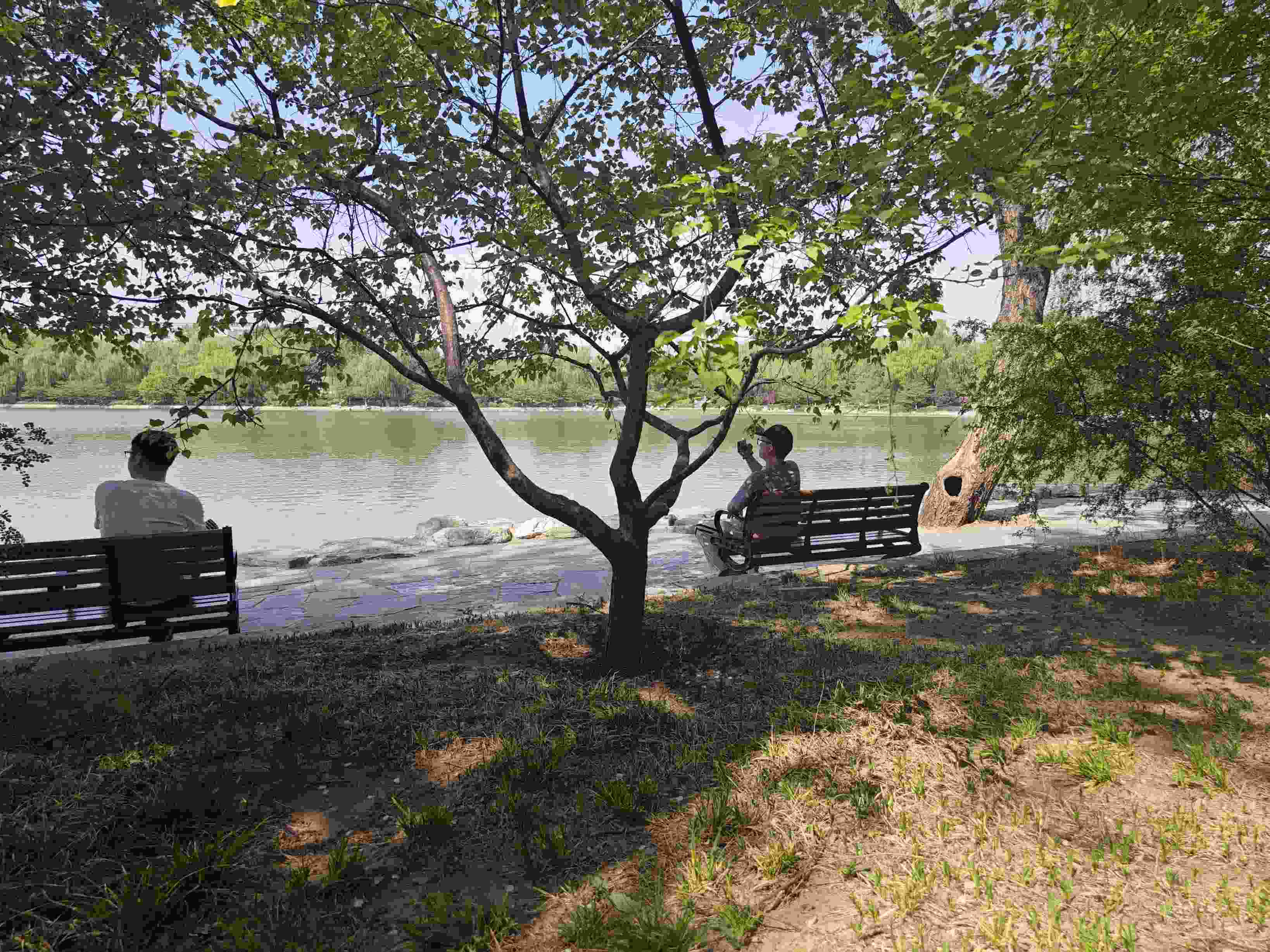 工作日午休時(shí)分的玉淵潭公園,也成了上班族的精神“快充站”。玉淵潭公園東湖旁,一排年輕人正悠閑地曬著太陽(yáng)。眼前的湖面開闊平靜,微風(fēng)拂面,頭頂垂柳依依,耳邊不時(shí)傳來清脆的鳥鳴聲。