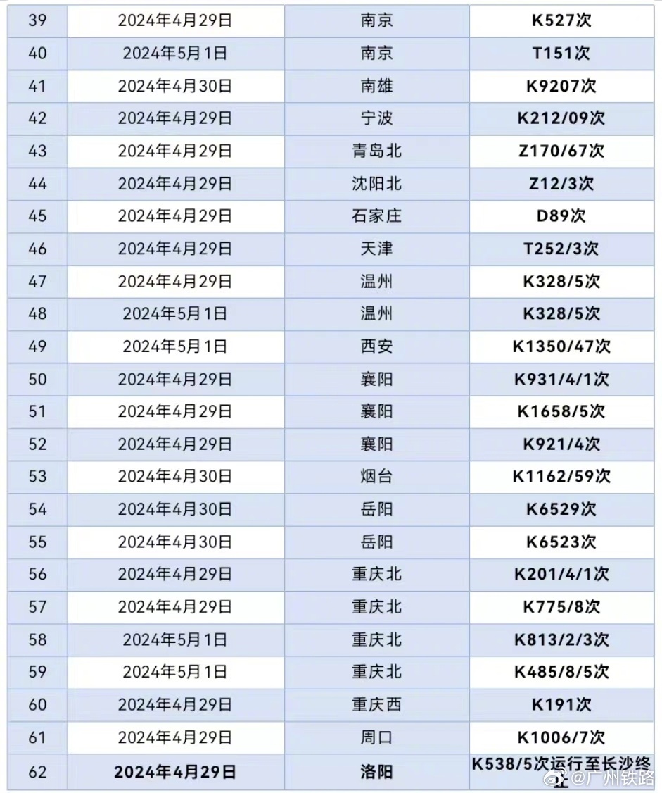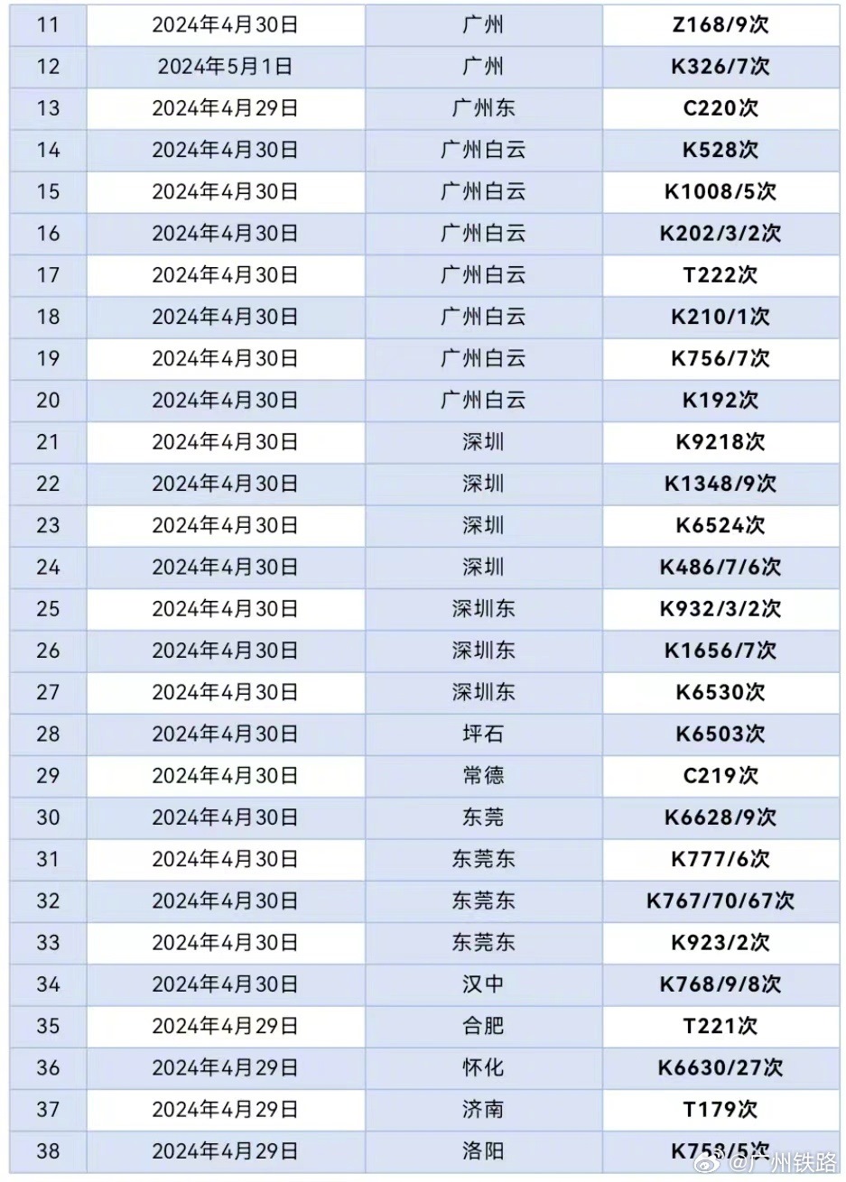 央視網(wǎng)消息:據(jù)@廣州鐵路 消息,據(jù)廣鐵集團(tuán)4月29日12時(shí)通報(bào),根據(jù)氣象部門(mén)消息,近期湖南大部、廣東中北部將出現(xiàn)較大范圍的大到暴雨,將對(duì)鐵路運(yùn)輸秩序造成一定的不利影響。廣鐵集團(tuán)于4月29日至5月1日期間計(jì)劃停運(yùn)京廣鐵路普速列車(chē)62列,京廣、京九普鐵和京廣高鐵的部分列車(chē)將出現(xiàn)不同程度晚點(diǎn)。