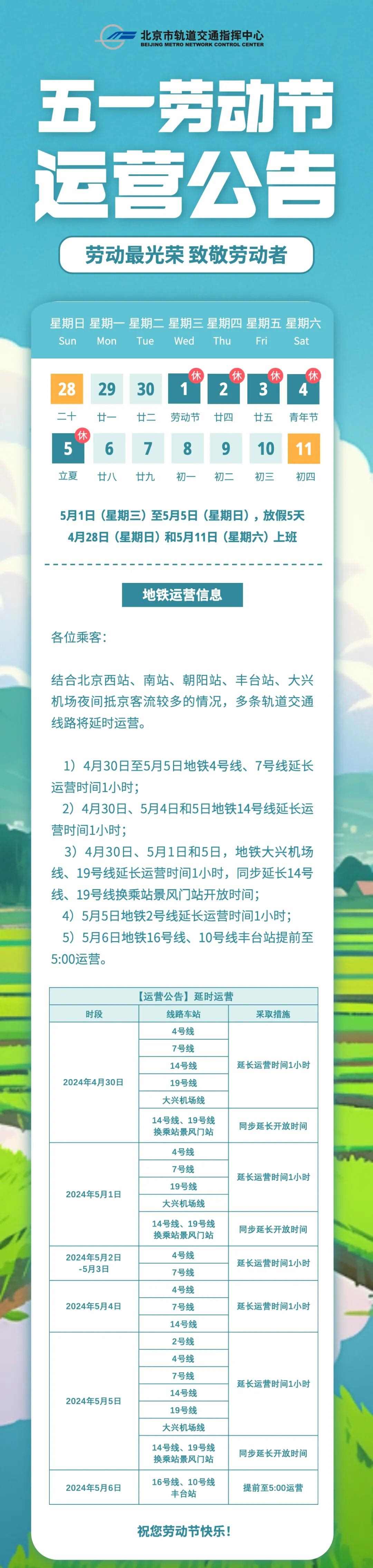 央視網(wǎng)消息:據(jù)北京軌道交通指揮中心消息,4月27日,北京軌道交通發(fā)布關(guān)于“五一”假期運(yùn)營調(diào)整的信息提示。