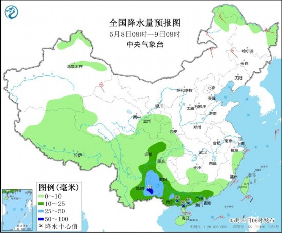 全國降水量預(yù)報圖(5月8日08時-9日08時)