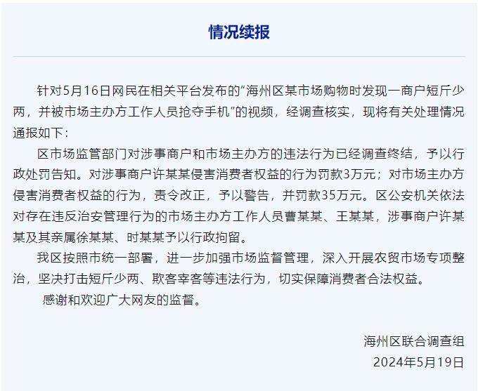 央視網(wǎng)消息:據(jù)“今日海州”微信公眾號消息,針對5月16日網(wǎng)民在相關(guān)平臺發(fā)布的“海州區(qū)某市場購物時(shí)發(fā)現(xiàn)一商戶短斤少兩,并被市場主辦方工作人員搶奪手機(jī)”的視頻,經(jīng)調(diào)查核實(shí),現(xiàn)將有關(guān)處理情況通報(bào)如下:區(qū)市場監(jiān)管部門對涉事商戶和市場主辦方的違法行為已經(jīng)調(diào)查終結(jié),予以行政處罰告知。對涉事商戶許某某侵害消費(fèi)者權(quán)益的行為罰款3萬元;對市場主辦方侵害消費(fèi)者權(quán)益的行為,責(zé)令改正,予以警告,并罰款35萬元。區(qū)公安機(jī)關(guān)依法對存在違反治安管理行為的市場主辦方工作人員曹某某、王某某,涉事商戶許某某及其親屬徐某某、時(shí)某某予以行政拘留。