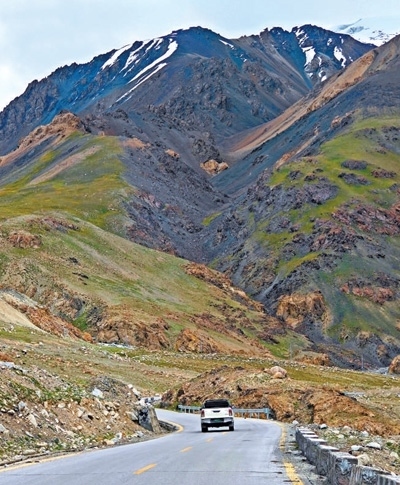 喀喇昆侖公路穿越巍峨險峻的喀喇昆侖山脈,大量路段位于高寒山地,地質(zhì)條件復(fù)雜,修建橋梁和隧道的工程難度大、危險性高。公路沿線有多處巴方設(shè)立的紀(jì)念地標(biāo),傳承兩國友誼。圖為一輛汽車行駛在喀喇昆侖公路上。本報巴基斯坦分社 賽義德·邁赫迪攝