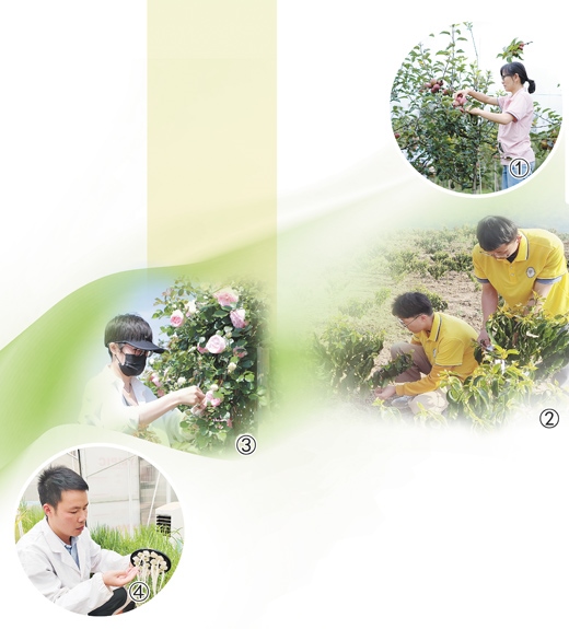 圖①:劉丹丹在調(diào)查蘋果病害情況。 圖②:咖啡團隊的學生們在咖啡田地里進行花芽分化調(diào)查。 圖③:周寧寧在進行月季雜交授粉。 圖④:雷貴杰在觀察水稻根系的生長狀況。以上圖片均為受訪者提供