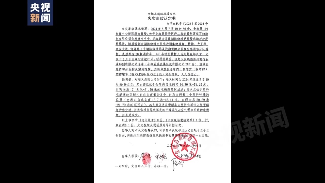 記者從全椒縣消防救援大隊(duì)于5月24日出具的火災(zāi)事故認(rèn)定書上發(fā)現(xiàn),5月7日晚上7點(diǎn)多,滁州富信助劑有限公司倉(cāng)庫(kù)發(fā)生火災(zāi),滁州市消防救援支隊(duì)調(diào)集30輛消防車、140名消防救援人員現(xiàn)場(chǎng)處置,火災(zāi)于5月8日0時(shí)許撲滅。經(jīng)現(xiàn)場(chǎng)勘驗(yàn),該起火災(zāi)燒損滁州富信石油助劑有限公司倉(cāng)庫(kù)、燒毀倉(cāng)庫(kù)內(nèi)部分貨物及塑料噸桶,并將停放在倉(cāng)庫(kù)內(nèi)正在卸粗甲醇的槽罐車完全燒毀,無人員傷亡。