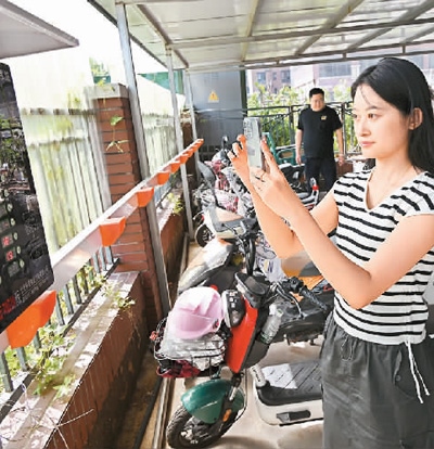 圖為市民在山東省膠州市九龍街道臨水宜家小區(qū)一電動自行車充電點掃碼充電。新華社記者 李紫恒攝