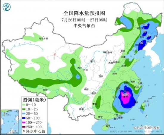 全國(guó)降水量預(yù)報(bào)圖(7月25日08時(shí)-26日08時(shí))
