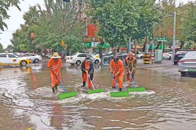 7月26日,遼寧省氣象局發(fā)布暴雨橙色預警。受強降水影響,遼寧有11個市啟動了防汛應急響應。圖為26日環(huán)衛(wèi)工人在沈陽市街頭清除積水。新華社發(fā)