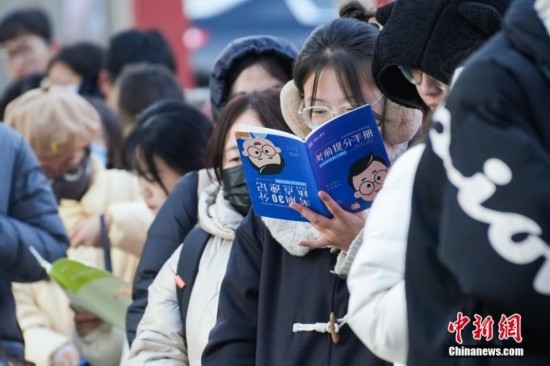 2023年11月26日,山西省太原市,考生在考場外復(fù)習。當日,中央機關(guān)及其直屬機構(gòu)2024年度考試錄用公務(wù)員公共科目筆試舉行。中新社記者 武俊杰 攝