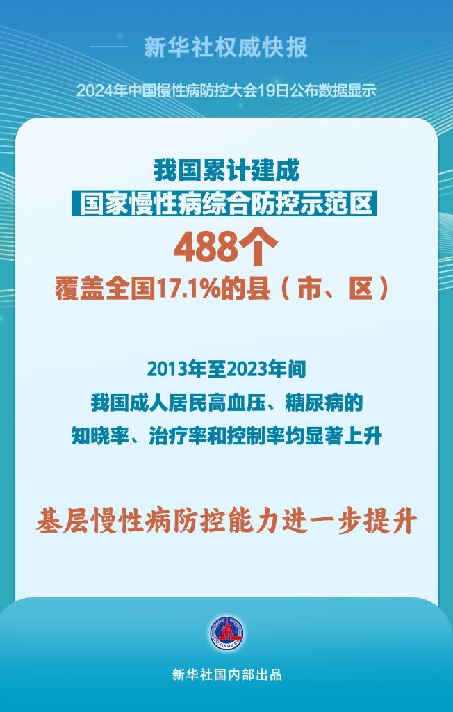 我國累計建成國家慢性病綜合防控示范區(qū)488個,覆蓋全國17.1%的縣(市、區(qū));2013年至2023年間,我國成人居民高血壓、糖尿病的知曉率、治療率和控制率均顯著上升……2024年中國慢性病防控大會10月19日在京舉行,會上公布數(shù)據(jù)顯示,我國慢性病防控能力進一步提升,防控水平進一步改善。