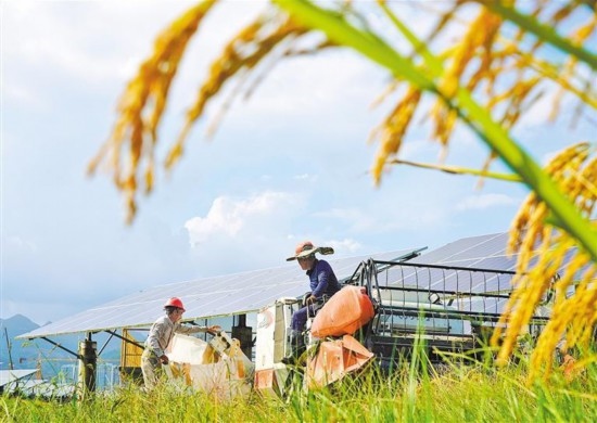 10月15日,浙江省樂(lè)清市勝利塘內(nèi)的“農(nóng)光互補(bǔ)”光伏發(fā)電項(xiàng)目基地,農(nóng)戶(hù)將收割好的稻谷裝袋。蔡寬元攝(中經(jīng)視覺(jué))