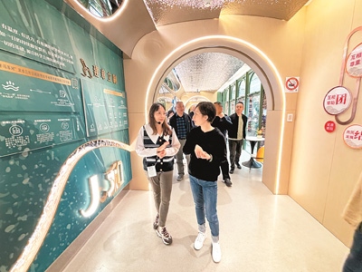 工作人員在“半馬蘇河驛站·1690黨群服務中心”向參觀者介紹蘇州河沿岸環(huán)境綜合整治提升情況。本報記者 李 貞攝