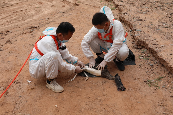 在甘肅張掖黑河濕地國家級自然保護區(qū),單國鋒(左)和同事為一只黑鸛戴上監(jiān)測設備(資料照片)。新華社發(fā)(甘肅張掖黑河濕地國家級自然保護區(qū)管理局供圖)