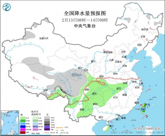 全國降水量預(yù)報圖(2月13日08時-14日08時) 圖片來源:中央氣象臺網(wǎng)站