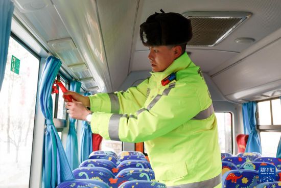 2月14日,烏魯木齊市公安局交警支隊(duì)水磨溝區(qū)大隊(duì)民警檢查校車安全錘。