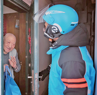 10點40分,記者與馬志鵬開始配送第二單。這一單相對遠些,需要穿過馬路進入另一個社區(qū)。騎行在路上,冷風撲面而來,雖然包裹嚴實,但冷風依然止不住地往身上鉆。七八分鐘后到達目的地,馬志鵬靠邊停車、拎出外賣、坐電梯上樓、找到門牌號,小跑了一路將飯菜送到老人家門口?!岸嘀x啊,你們送到門口,省了我很多麻煩。”蔣老先生說。