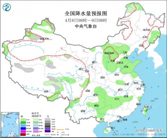 4月8日08時(shí)至9日08時(shí),新疆北部、內(nèi)蒙古中東部、西藏北部、青海南部等地有小到中雪或雨夾雪,內(nèi)蒙古中部、陜西北部、山西、河北北部和南部、山東、貴州東部和南部、湖南中南部、江西中部、廣西中北部、海南島、臺(tái)灣島等地有小到中雨。內(nèi)蒙古大部、甘肅河西、陜西中北部、山西等地部分地區(qū)有4~6級(jí)風(fēng),陣風(fēng)7級(jí)。