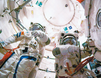 神舟十九號(hào)航天員蔡旭哲(右)、宋令東在做出艙準(zhǔn)備。