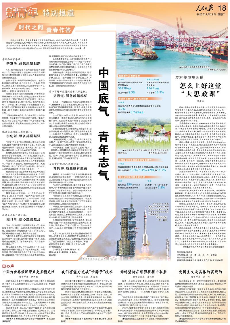 青年興則國(guó)家興,中國(guó)發(fā)展要靠廣大青年挺膺擔(dān)當(dāng)。面對(duì)復(fù)雜嚴(yán)峻的外部環(huán)境,廣大青年堅(jiān)定信心、保持定力,集中精力辦好自己的事,不斷增強(qiáng)做中國(guó)人的志氣、骨氣、底氣,樹立為祖國(guó)為人民永久奮斗、赤誠(chéng)奉獻(xiàn)的堅(jiān)定理想。本期報(bào)道,我們聚焦來自不同行業(yè)奮戰(zhàn)在各自崗位的青年人,展現(xiàn)他們自信自強(qiáng)、剛健有為,為中國(guó)式現(xiàn)代化挺膺擔(dān)當(dāng)?shù)男拍钆c風(fēng)采。