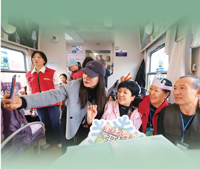 為讓銀發(fā)旅游更加精彩,銀發(fā)旅游列車不僅注重適老化改造,還通過特色主題表演,為老年游客帶來豐富的旅行體驗。在Y471次熊貓旅游專列上,游客們可以欣賞到別具特色的川劇變臉。在黑龍江的冰雪旅拍主題旅游列車上,車廂內融合哈爾濱各類景點進行主題場景設計,老年游客只需掃碼預約便可換上不同風格的服裝在車廂內拍照打卡。列車上,老年游客不僅樂趣十足,還留下許多美好回憶。