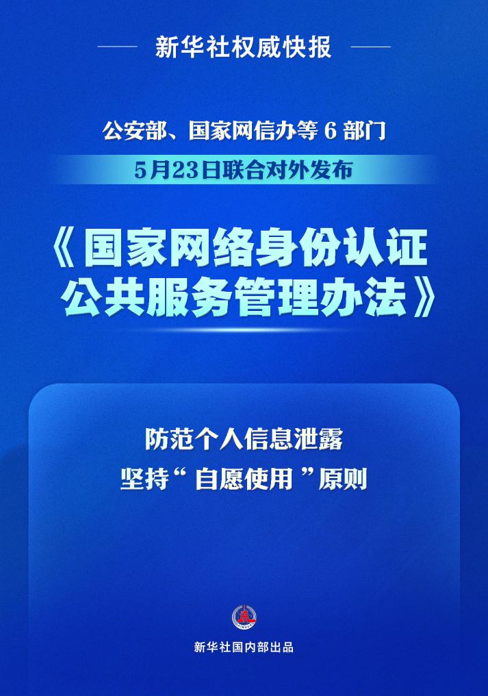 破解公民身份信息網(wǎng)絡(luò)泄露難題,加強(qiáng)個(gè)人信息保護(hù)。公安部、國家網(wǎng)信辦等6部門5月23日聯(lián)合對外發(fā)布《國家網(wǎng)絡(luò)身份認(rèn)證公共服務(wù)管理辦法》,推進(jìn)國家網(wǎng)絡(luò)身份認(rèn)證公共服務(wù)建設(shè),進(jìn)一步推廣應(yīng)用公共服務(wù)。