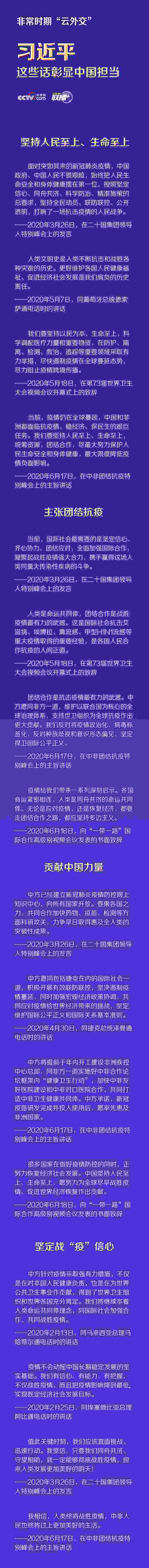 截至目前,習(xí)近平主席已經(jīng)同數(shù)十位外國領(lǐng)導(dǎo)人及國際組織負責(zé)人通話或見面,出席二十國集團領(lǐng)導(dǎo)人應(yīng)對新冠肺炎特別峰會,在第73屆世界衛(wèi)生大會視頻會議開幕式上致辭,主持中非團結(jié)抗疫特別峰會并發(fā)表主旨講話等,開啟了以電話、書信、視頻為主渠道的“云外交”模式。