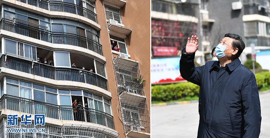 3月10日,習(xí)近平專(zhuān)門(mén)赴湖北省武漢市考察新冠肺炎疫情防控工作。這是習(xí)近平在東湖新城社區(qū)考察時(shí),向在家隔離居住的居民揮手致意、表示慰問(wèn)(拼版照片)。