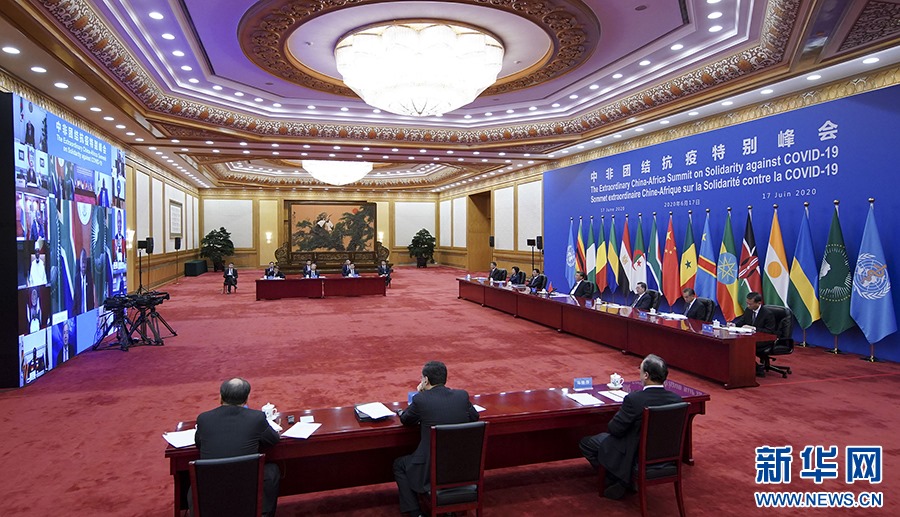6月17日晚,習(xí)近平在北京主持中非團(tuán)結(jié)抗疫特別峰會(huì)并發(fā)表題為《團(tuán)結(jié)抗疫 共克時(shí)艱》的主旨講話。 新華社記者 丁海濤 攝
