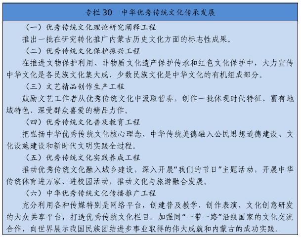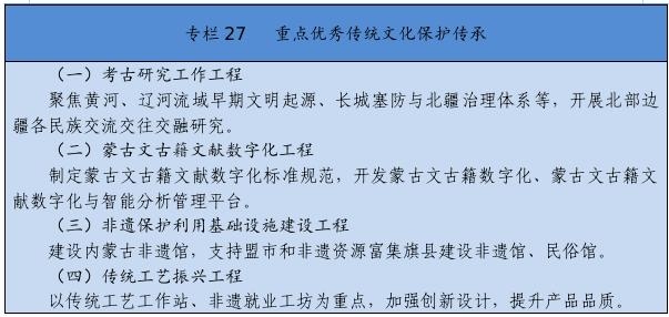 實(shí)施文化遺產(chǎn)系統(tǒng)性保護(hù)工程,強(qiáng)化重要文化和自然遺產(chǎn)、非物質(zhì)文化遺產(chǎn)系統(tǒng)性保護(hù),建立整體保護(hù)、活態(tài)傳承、創(chuàng)新發(fā)展體系。實(shí)施重大文物保護(hù)工程,推進(jìn)長城、黃河國家文化公園和大窯、遼上京、和林格爾土城子等國家考古遺址公園建設(shè)。推動萬里茶道(內(nèi)蒙古段)、遼上京和祖陵遺址、紅山遺址群和陰山巖刻申遺。加強(qiáng)阿爾寨石窟寺等石窟文物保護(hù)。開展“中華文明探源”工程、“考古中國”河套地區(qū)早期聚落遺址考古發(fā)掘研究。建設(shè)內(nèi)蒙古非遺博覽園、內(nèi)蒙古黃河文化博物館、內(nèi)蒙古工業(yè)博物館。加強(qiáng)紀(jì)念館、展覽館、博物館建設(shè)管理。推進(jìn)民族優(yōu)秀傳統(tǒng)手工藝保護(hù)傳承和振興,完善非遺名錄體系。實(shí)施中華傳統(tǒng)節(jié)日振興工程,開展傳統(tǒng)節(jié)日禮儀禮節(jié)教育活動。