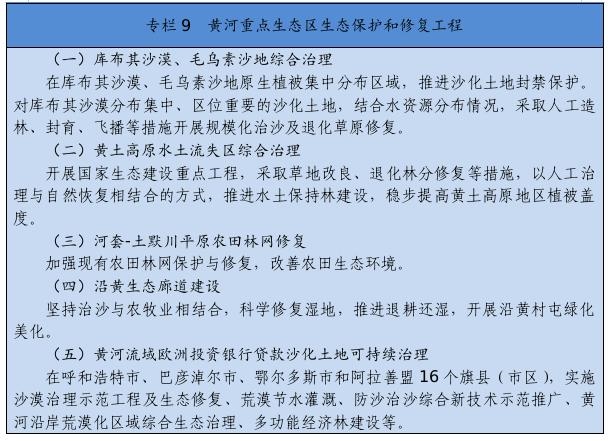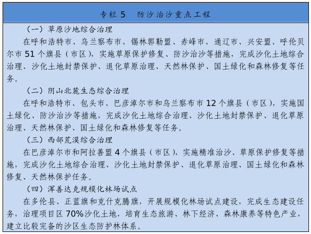 繼續(xù)實(shí)施京津風(fēng)沙源治理等重點(diǎn)工程,推廣庫布其沙漠治理方式和沙產(chǎn)業(yè)模式,推動渾善達(dá)克、烏珠穆沁、呼倫貝爾沙地治理。推進(jìn)規(guī)?;謭鼋ㄔO(shè),采取人工造林、封沙育林、飛播造林等方式恢復(fù)植被。建設(shè)荒漠綠洲防護(hù)林、防風(fēng)固沙林、沙漠鎖邊林、農(nóng)田草牧場防護(hù)林以及水土保持林。以干旱半干旱草原為重點(diǎn),加強(qiáng)草場改良和人工種草,實(shí)行圍封禁牧、劃區(qū)輪牧、季節(jié)性休牧、舍飼圈養(yǎng)等措施,保護(hù)和恢復(fù)草原植被。以內(nèi)蒙古高原等為重點(diǎn),推進(jìn)防護(hù)林體系建設(shè)及退化林修復(fù)、退化草原修復(fù)、京津風(fēng)沙源治理。新增水土流失綜合治理3.33萬平方公里。