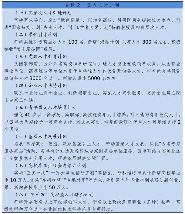 著力抓好高層次創(chuàng)新型領(lǐng)軍人才、青年拔尖人才、高技能人才、各類急需緊缺人才隊(duì)伍建設(shè)。實(shí)施人才工程計(jì)劃,選拔推薦全國杰出專業(yè)技術(shù)人才、政府特殊津貼專家、國家百千萬人才工程人選,組織評選自治區(qū)杰出人才獎、突出貢獻(xiàn)專家、青年創(chuàng)新人才獎,選拔培養(yǎng)自治區(qū)“草原英才”工程、新世紀(jì)321人才工程、511人才培養(yǎng)工程人選。實(shí)施專業(yè)技術(shù)人才知識更新工程。加強(qiáng)基層專業(yè)技術(shù)人才隊(duì)伍建設(shè),引導(dǎo)人才向基層一線和艱苦地區(qū)流動。實(shí)施“百千萬”高技能人才培養(yǎng)計(jì)劃。