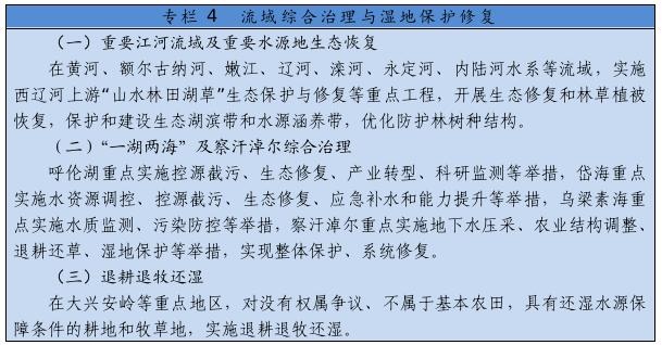 大力推進(jìn)黃河生態(tài)帶建設(shè),統(tǒng)籌水環(huán)境、水生態(tài)、水資源、水安全、水文化,推進(jìn)干支流一體化治理,突出抓好十大孔兌、多沙粗砂區(qū)集中來源區(qū)等水土保持治理,實(shí)施河道和灘區(qū)綜合提升治理工程,完善水沙調(diào)控機(jī)制。深化“一湖兩海”及察汗淖爾生態(tài)環(huán)境綜合治理,創(chuàng)新區(qū)域系統(tǒng)治理和流域整體治理舉措,逐步改善生態(tài)環(huán)境。全面加強(qiáng)嫩江、遼河、內(nèi)陸河水系等流域和達(dá)里諾爾、烏拉蓋等濕地生態(tài)保護(hù)修復(fù),深入開展地下水超采綜合治理。