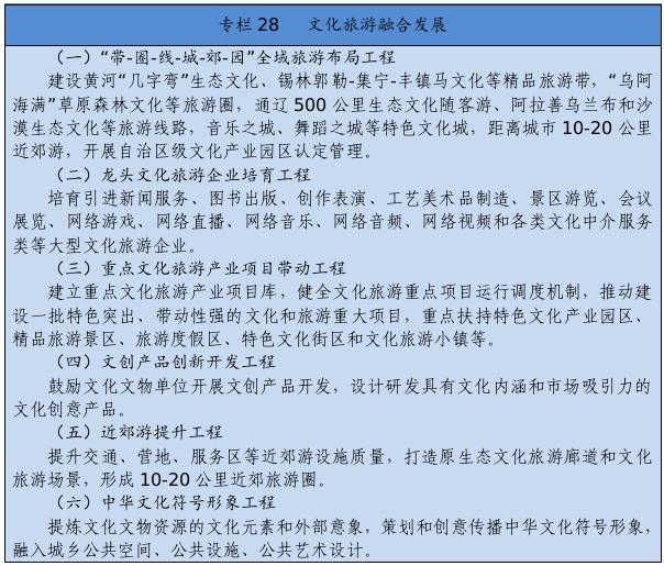 建立健全把社會效益放在首位、社會效益和經(jīng)濟(jì)效益相統(tǒng)一的文化創(chuàng)作生產(chǎn)體制機(jī)制。完善文化管理體制和生產(chǎn)經(jīng)營機(jī)制。健全現(xiàn)代文化產(chǎn)業(yè)體系和市場體系。完善文化和旅游融合發(fā)展體制機(jī)制。推進(jìn)內(nèi)蒙古藝術(shù)劇院等國有文藝院團(tuán)和烏蘭牧騎改革。完善文化企業(yè)履行社會責(zé)任制度,健全引導(dǎo)新型文化業(yè)態(tài)健康發(fā)展機(jī)制。深化國有文化企業(yè)改革,加快重組整合、結(jié)構(gòu)調(diào)整、多元化發(fā)展。健全文物保護(hù)利用法律制度和標(biāo)準(zhǔn)規(guī)范。設(shè)立文化產(chǎn)業(yè)發(fā)展專項(xiàng)資金。