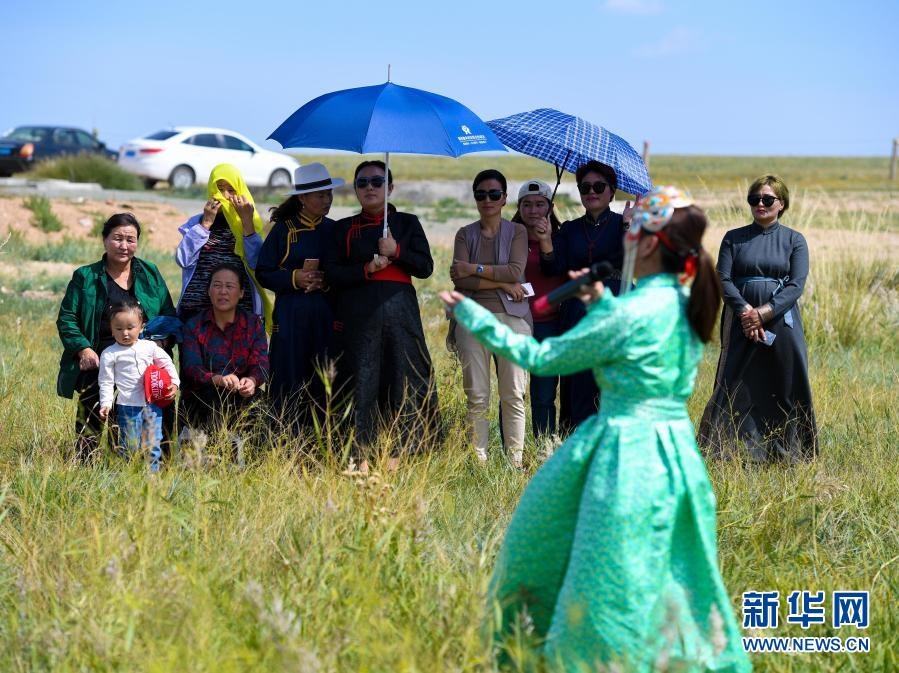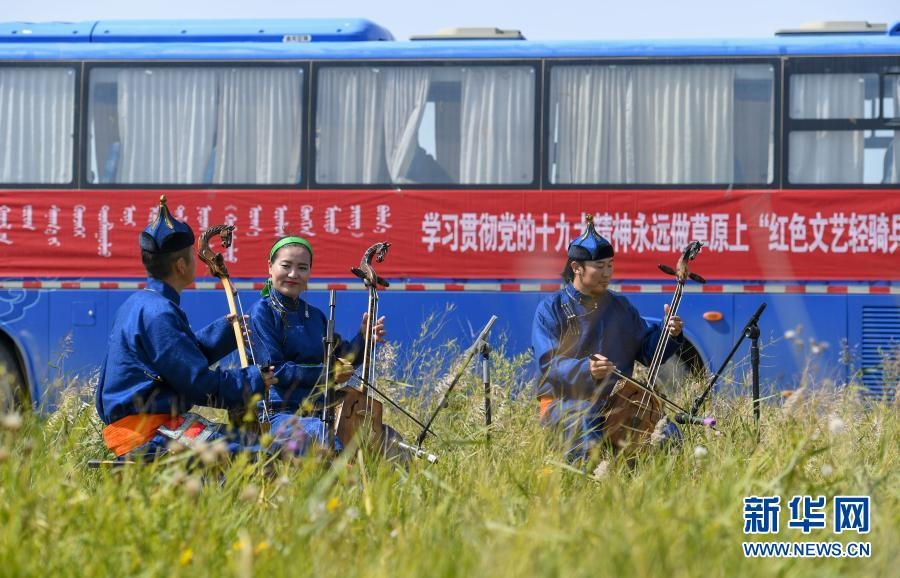 2018年9月13日,在內(nèi)蒙古自治區(qū)錫林郭勒盟鑲黃旗寶格達(dá)音高勒蘇木浩尼欽哈夏圖嘎查的一處草場,鑲黃旗烏蘭牧騎的隊(duì)員在為牧民表演文藝節(jié)目。新華社記者 彭源 攝