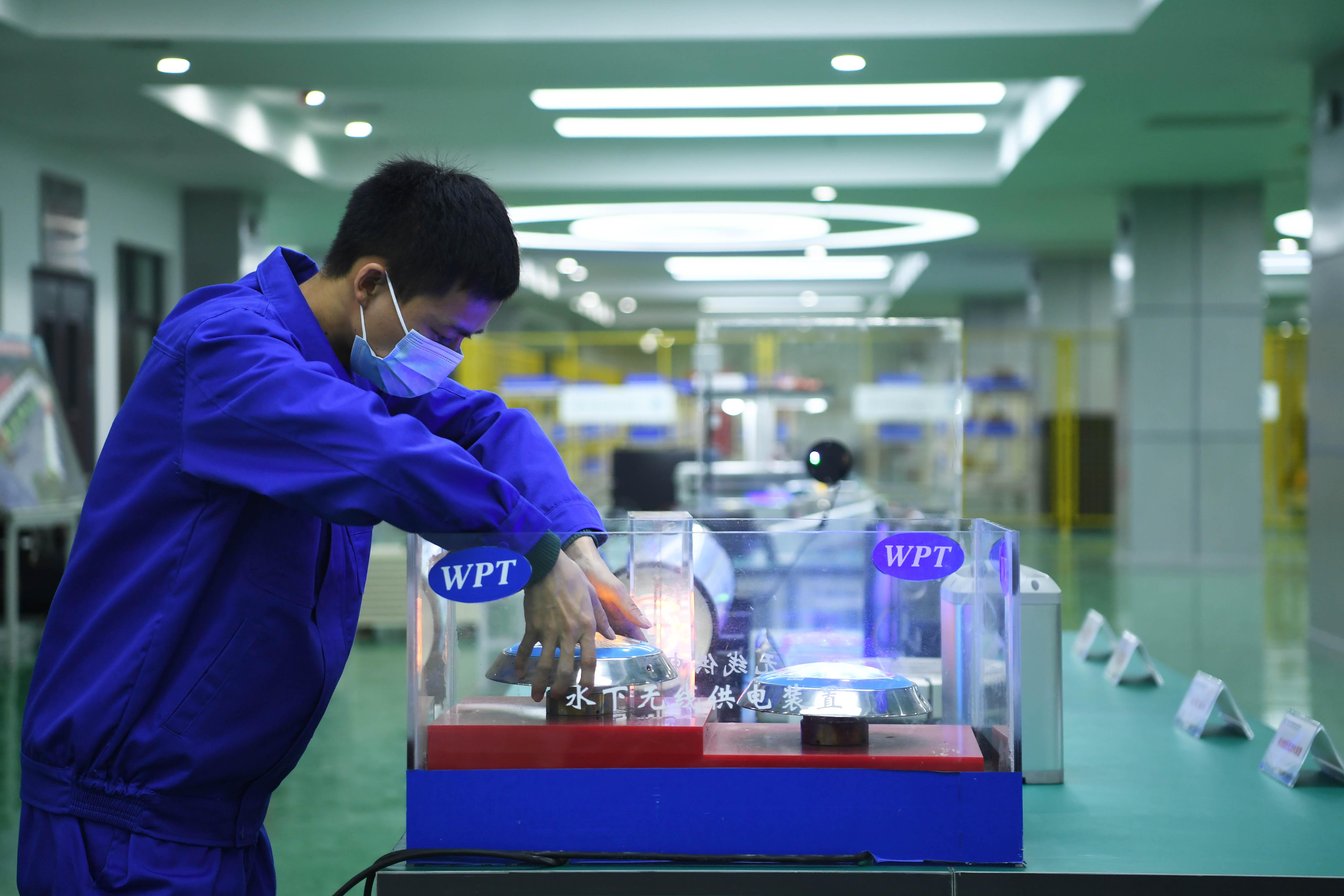 △重慶一科技企業(yè)的工作人員正在測(cè)試水下無(wú)線供電裝置。