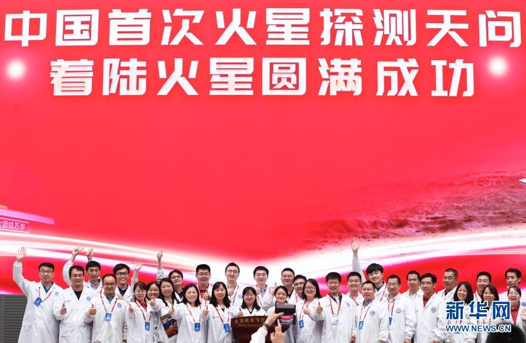 5月15日,航天科研人員在北京航天飛行控制中心指揮大廳慶祝我國(guó)首次火星探測(cè)任務(wù)著陸火星成功。新華社記者 金立旺 攝