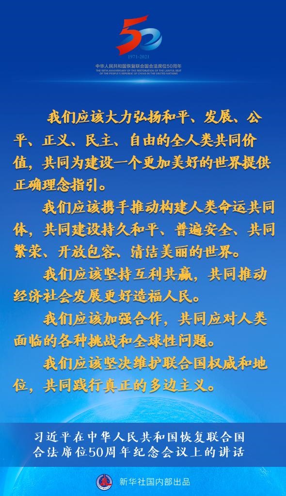 2021年10月25日,國家主席習(xí)近平在北京出席中華人民共和國恢復(fù)聯(lián)合國合法席位50周年紀(jì)念會(huì)議并發(fā)表重要講話。新華社記者李響攝