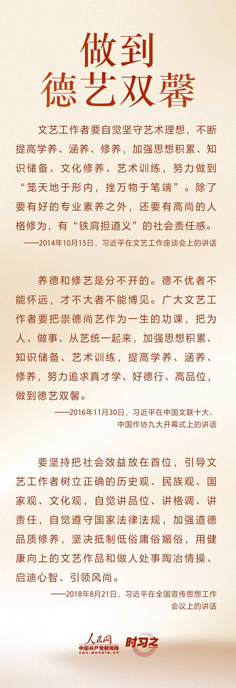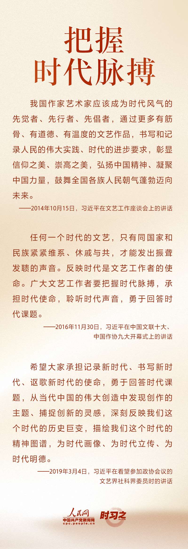 文運同國運相牽,文脈同國脈相連。新時代文藝工作者承擔著記錄新時代、書寫新時代、謳歌新時代的重大使命?!拔乃囀氰T造靈魂的工程,文藝工作者是靈魂的工程師?!秉h的十八大以來,習近平不斷激勵文藝工作者不辜負時代召喚、不辜負人民期待,以德服人、以文化人。