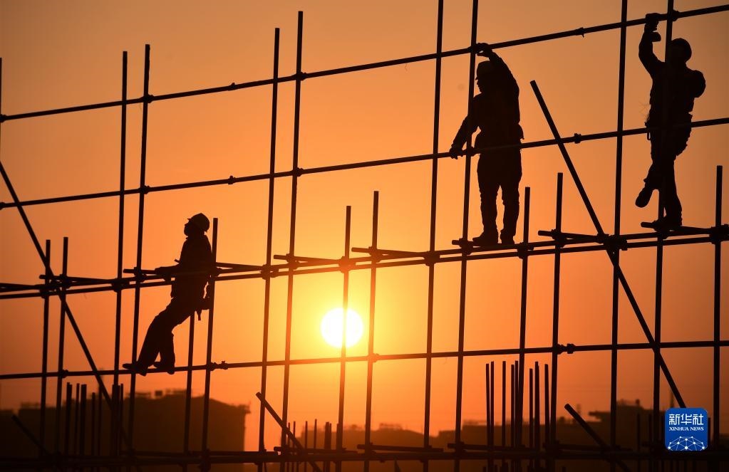 2022年1月1日,在河北雄安新區(qū)容西安置房項(xiàng)目D標(biāo)段施工現(xiàn)場,中鐵上海工程局工人在新年第一縷陽光的照耀下工作。新華社發(fā)(傅新春 攝)