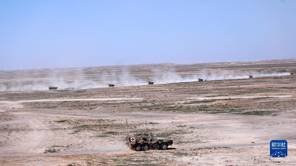在“西部·聯(lián)合-2021”演習(xí)第一次實(shí)兵實(shí)裝實(shí)彈合練中,野戰(zhàn)救護(hù)力量為聯(lián)合任務(wù)部隊(duì)提供保障(2021年8月5日攝)。新華社記者劉芳攝