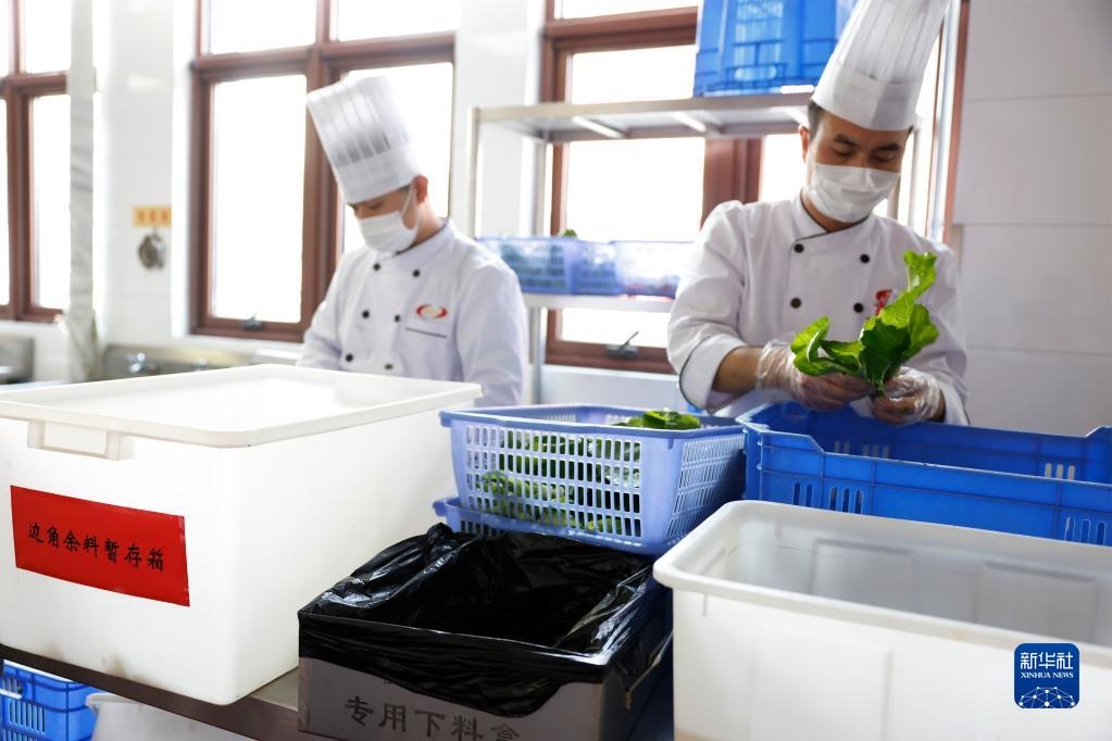 在某中央國家機關食堂,廚師將菜根等邊角余料放入暫存箱(2020年10月26日攝)。新華社記者 劉彬 攝