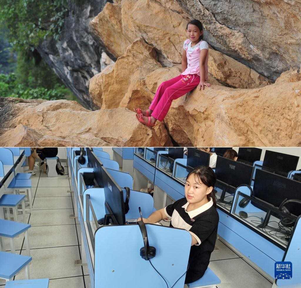 這是一張拼版照片,上圖為:在廣西大化瑤族自治縣板升鄉(xiāng)弄雷村哈保屯,11歲的蒙秋艷在懸崖邊休息,這一處約300米長的半山懸崖,是她讀小學(xué)期間每天都要走的路(2012年9月5日新華社記者黃孝邦攝);下圖為:已經(jīng)實現(xiàn)大學(xué)夢想的蒙秋艷,就讀于廣西醫(yī)科大學(xué),這是她在學(xué)校的語音室學(xué)習(xí)(新華社發(fā),2022年9月5日韋婷婷攝)。新華社發(fā)